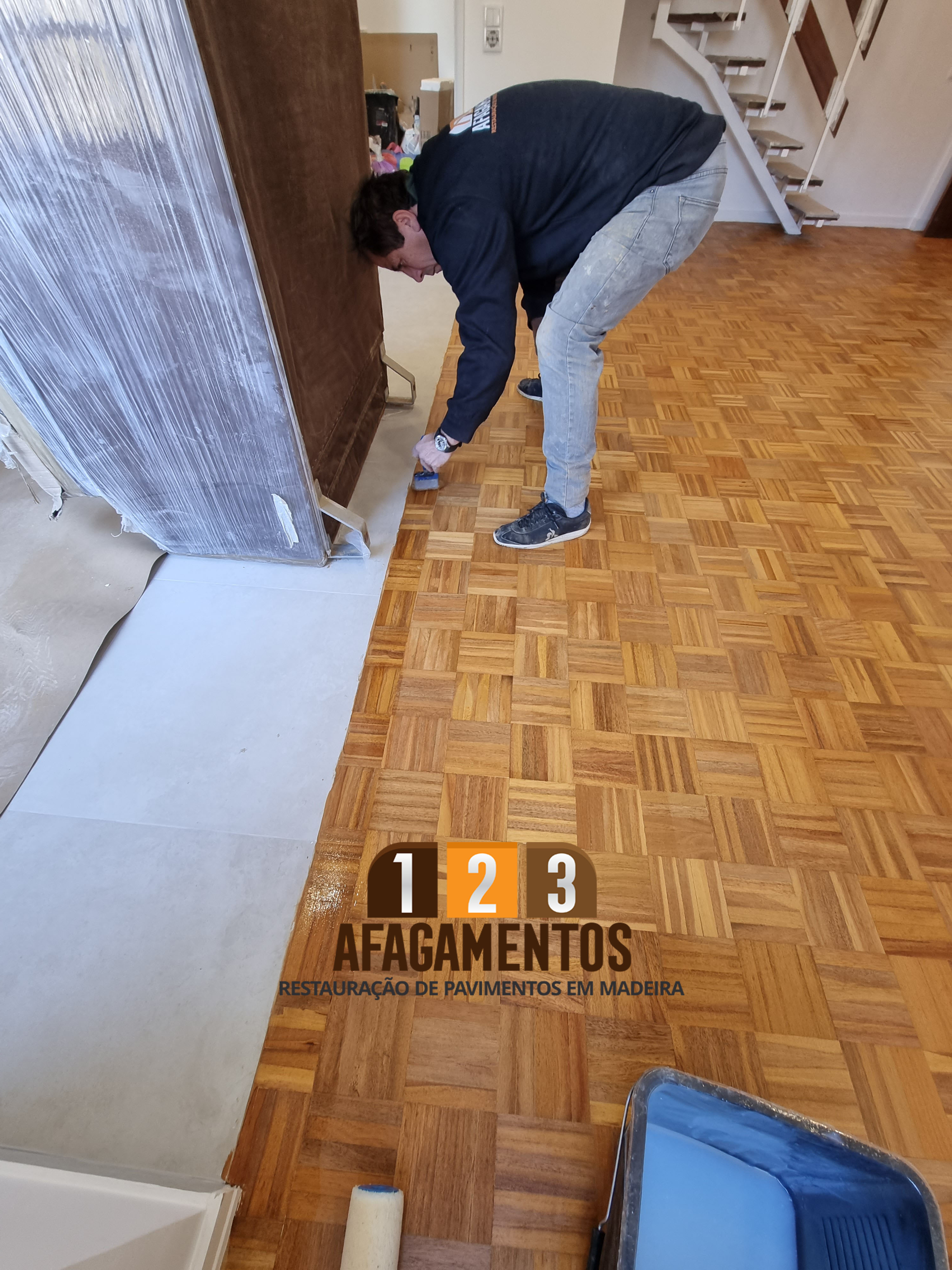 Nesta obra colamos os tacos soltos, foi feito o afagamento, a betumagem das juntas e o envernizamento com 3 de mãos de verniz meio-brilho.